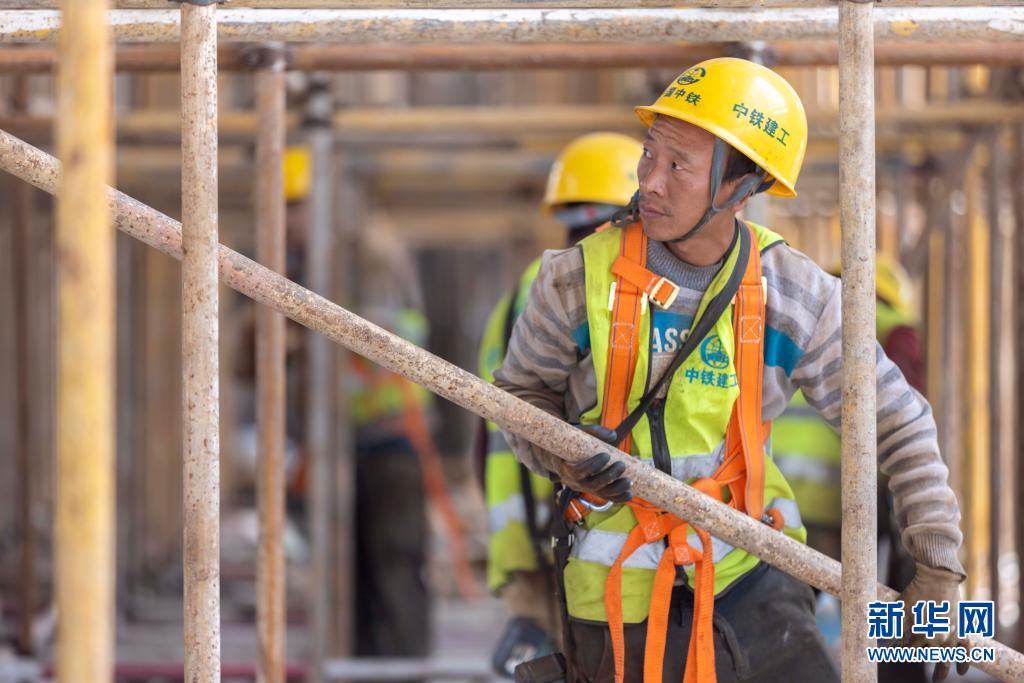5月1日,中鐵建工集團上海九星城項目的工人在工地搭設腳手架。