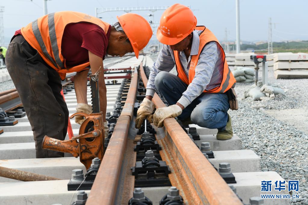 5月1日,工人在中老鐵路國內段云南西雙版納火車站工地進行鋪軌作業。