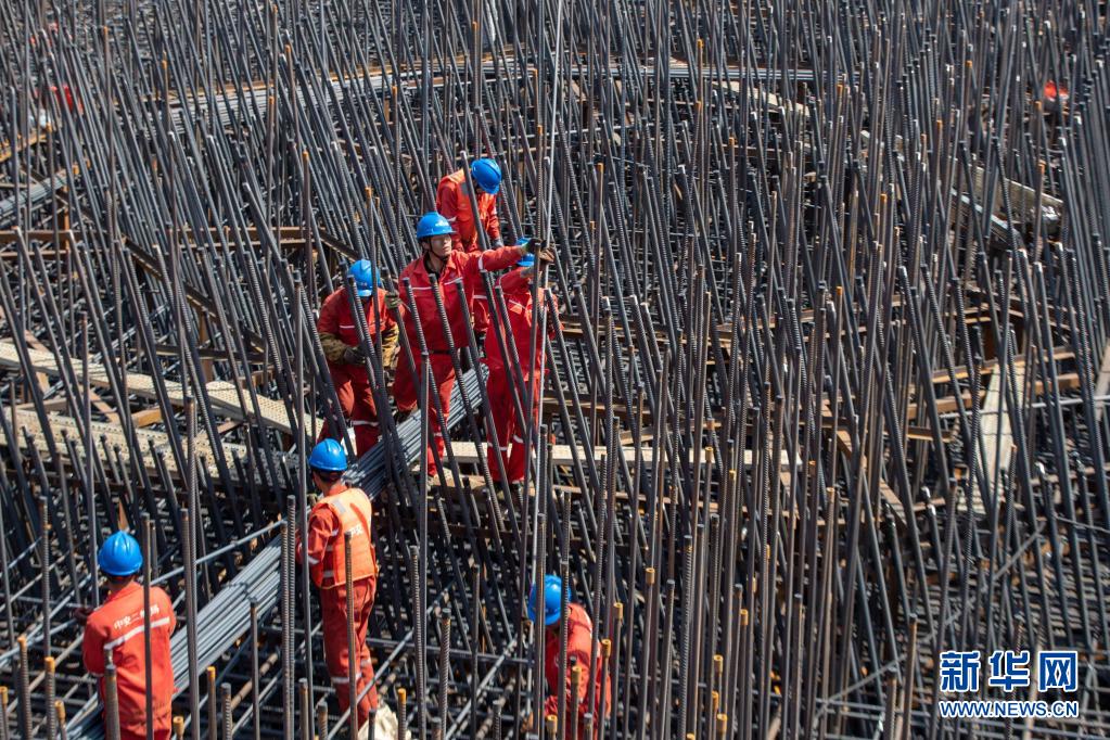 5月1日,在江蘇泰州的常泰長江大橋建設工地,工人進行鋼筋綁扎施工。