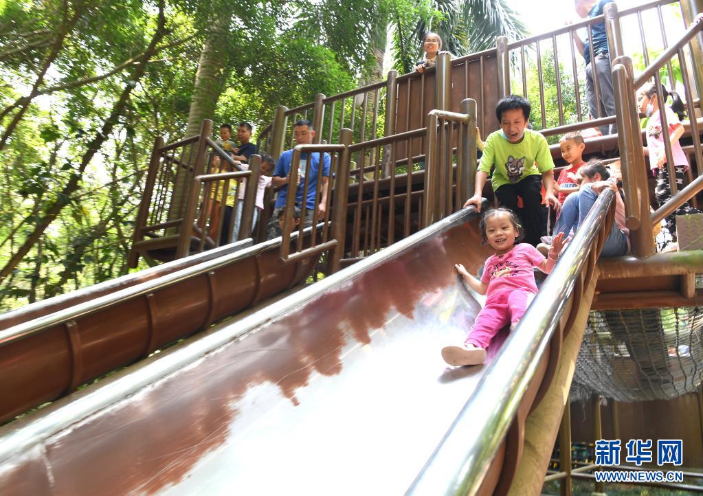 5月1日,孩子們在廣西南寧市青秀山風景區陸地拓展競技樂園玩耍。
