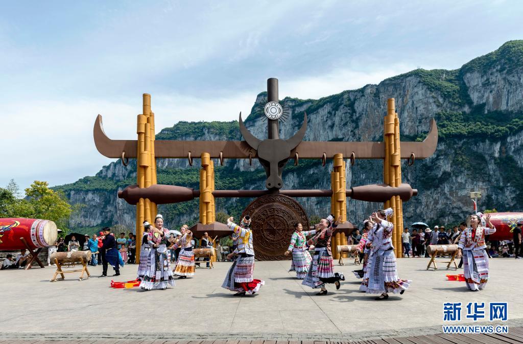 5月1日,在貴州省畢節(jié)市黔西縣新仁苗族鄉(xiāng)化屋景區(qū)文化廣場上,村民為游客表演苗族歌舞。