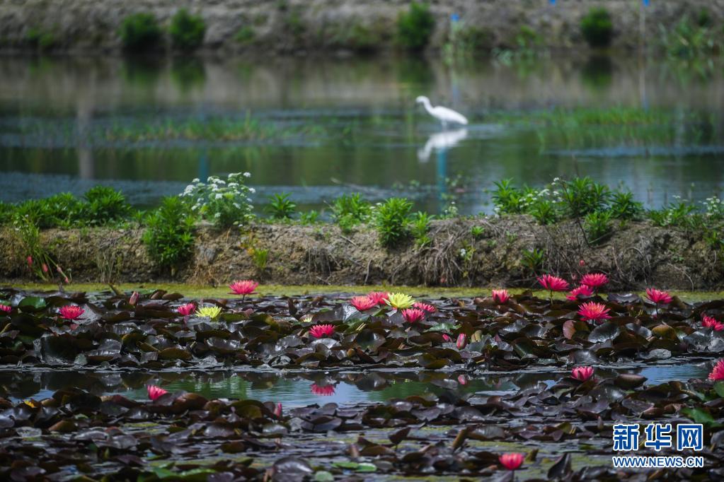 在東林鎮(zhèn)東方村,水田里種植的睡蓮盛開(5月7日攝)。