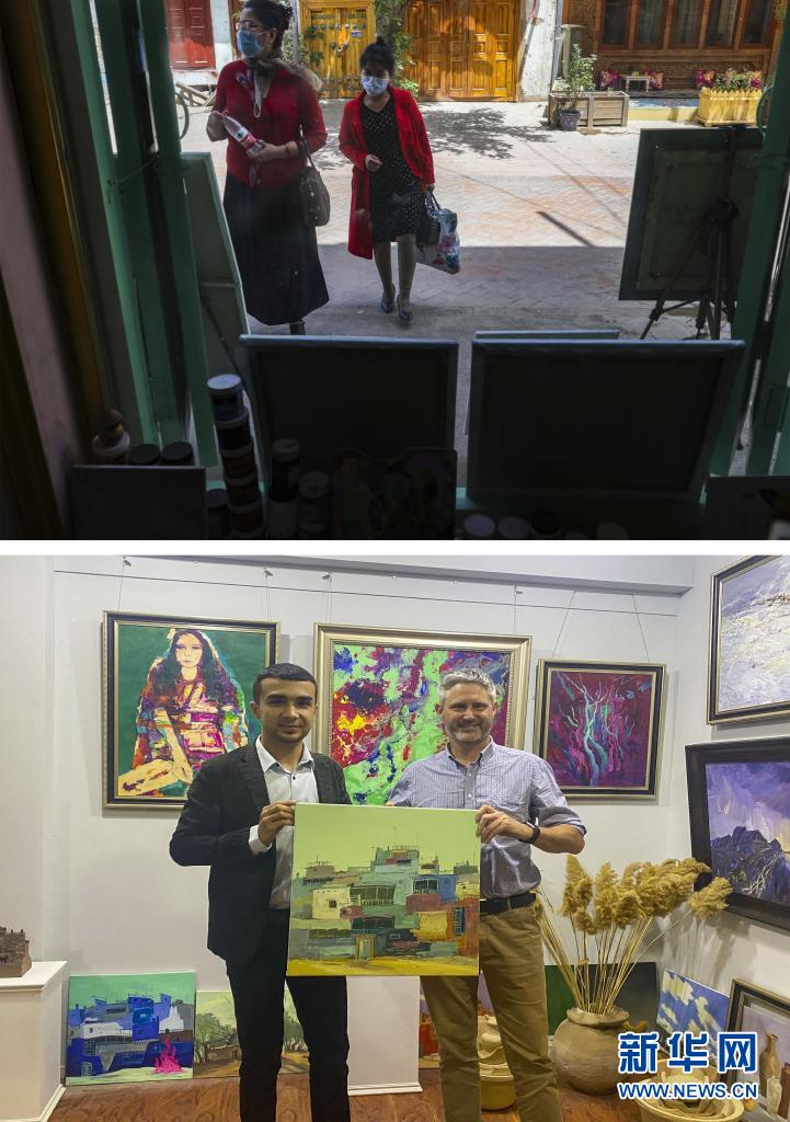 拼版照片:上圖為兩名行人在麥麥提吐爾遜江的工作室外觀看畫作(5月8日,新華社記者胡虎虎攝);下圖為“五一”期間,一名來自烏克蘭的游客(右)購(gòu)買畫作后與麥麥提吐爾遜江合影(受訪者供圖)。新華社發(fā)