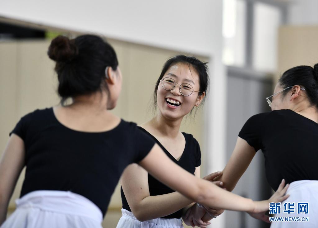 天津理工大學(xué)聾人工學(xué)院的舞蹈隊(duì)員們?cè)谂啪毱陂g交流(5月8日攝)。新華社記者 趙子碩 攝