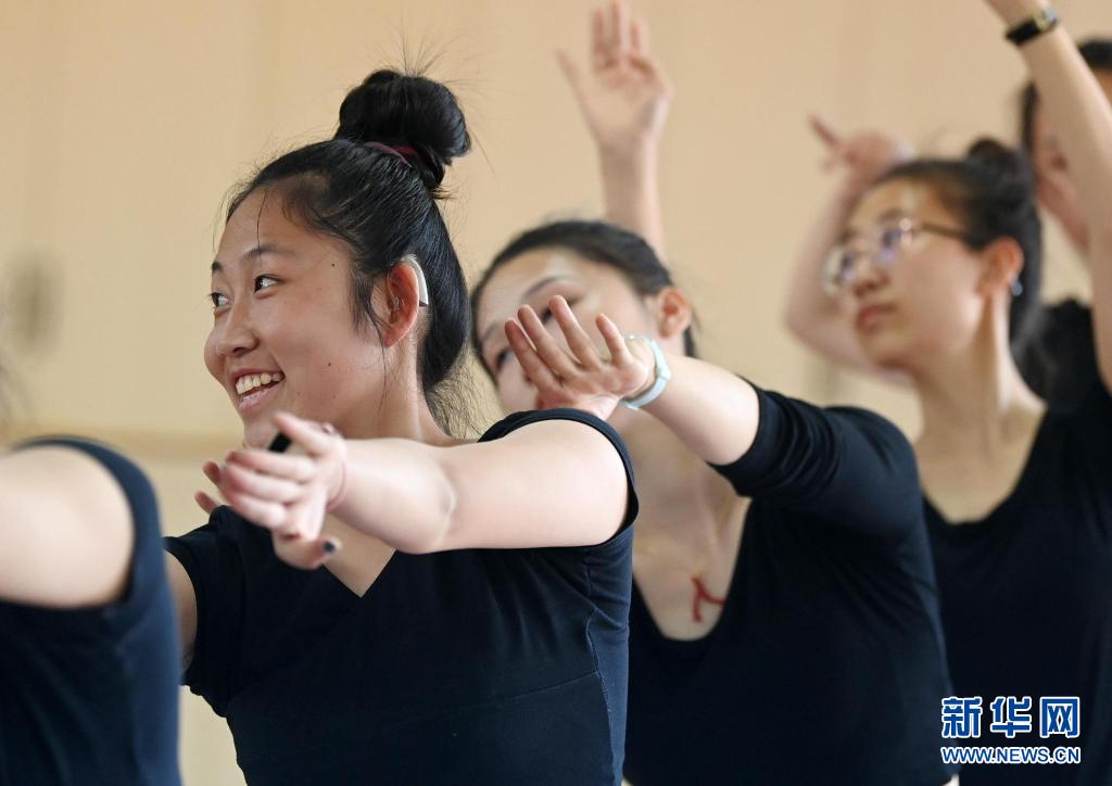 天津理工大學(xué)聾人工學(xué)院的舞蹈隊(duì)員們?cè)趯W(xué)院的排練廳里練習(xí)舞蹈動(dòng)作(5月8日攝)。新華社記者 李然 攝