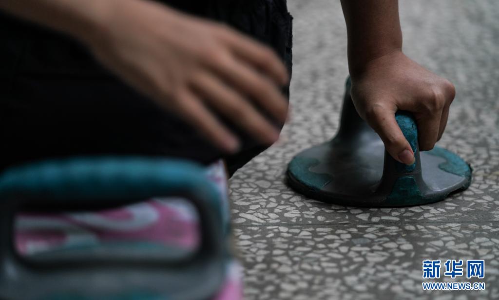 2021年5月10日,蔣張子怡借助滑板和吸盤在學校內穿行。