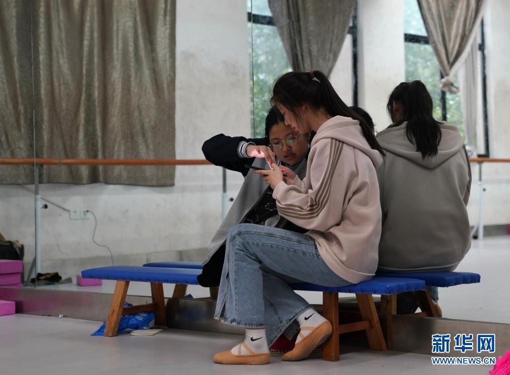2021年5月11日,蔣張子怡(左)在學(xué)校的舞蹈房內(nèi)和同學(xué)交流舞蹈動作。