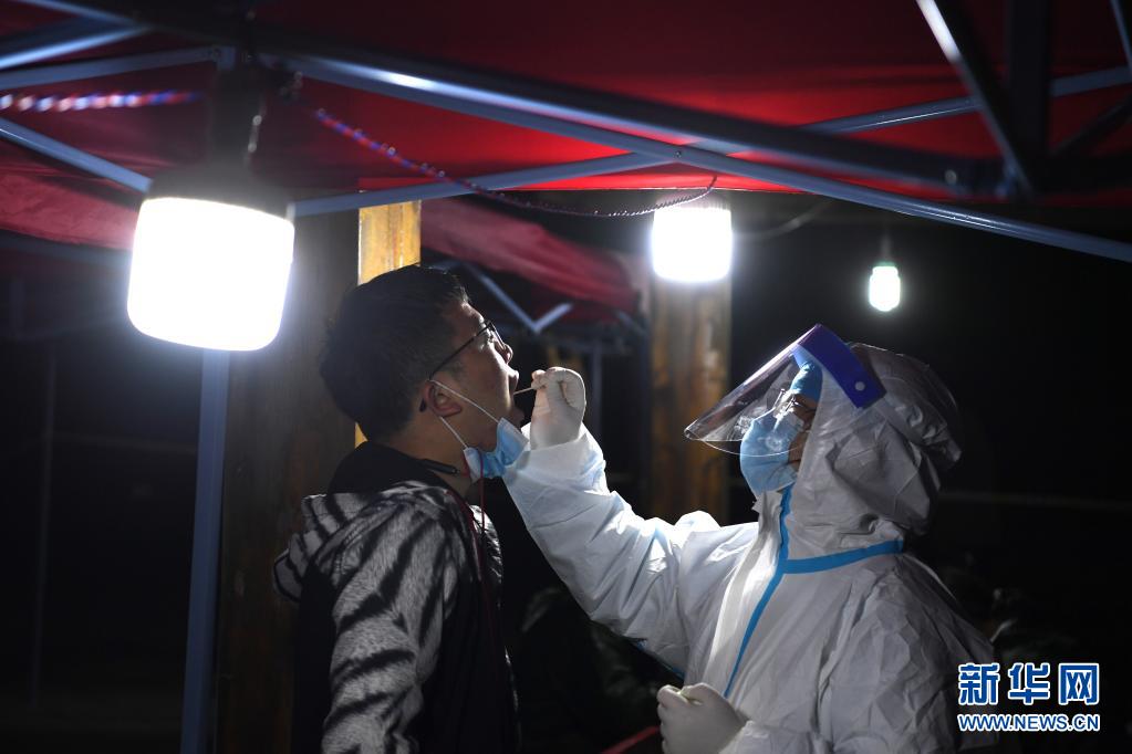 5月16日晚,在肥西縣上派鎮一小區,工作人員為居民進行核酸采樣。