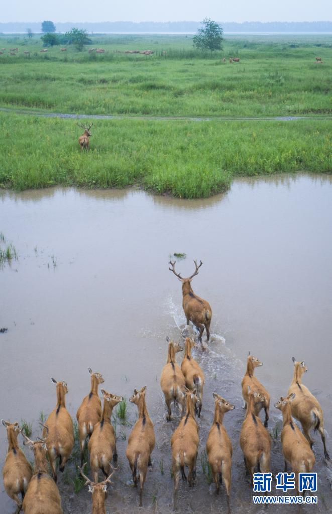 5月17日,一群麋鹿在石首麋鹿國家級自然保護區內活動(無人機照片)。新華社記者 肖藝九 攝