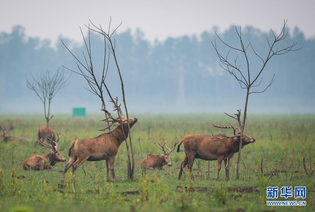 5月17日,一群麋鹿在石首麋鹿國家級自然保護區內活動。新華社記者 肖藝九 攝