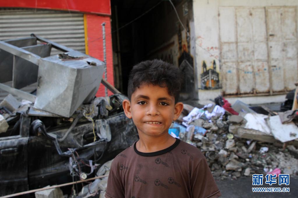 5月19日,7歲的巴勒斯坦兒童艾哈邁德·哈桑寧站在加沙城受空襲損毀的房屋旁。