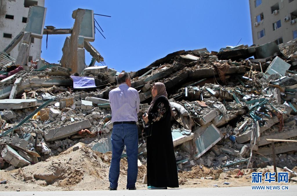 5月23日,巴勒斯坦人在加沙城望著遭以軍空襲損毀的賈拉塔。5月10日以來,以色列與加沙地帶武裝組織之間爆發(fā)嚴(yán)重沖突。20日晚,哈馬斯與以色列方面各自宣布,雙方已達成停火協(xié)議,停火從21日凌晨開始。新華社發(fā)(里澤克·阿卜杜勒·賈瓦德攝)