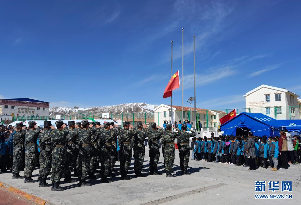 5月24日,武警青海總隊果洛支隊機動大隊官兵與花石峽鎮(zhèn)藏文中心寄宿制小學(xué)的師生一同參加升國旗儀式。新華社發(fā)(宦爵才郎 攝)
