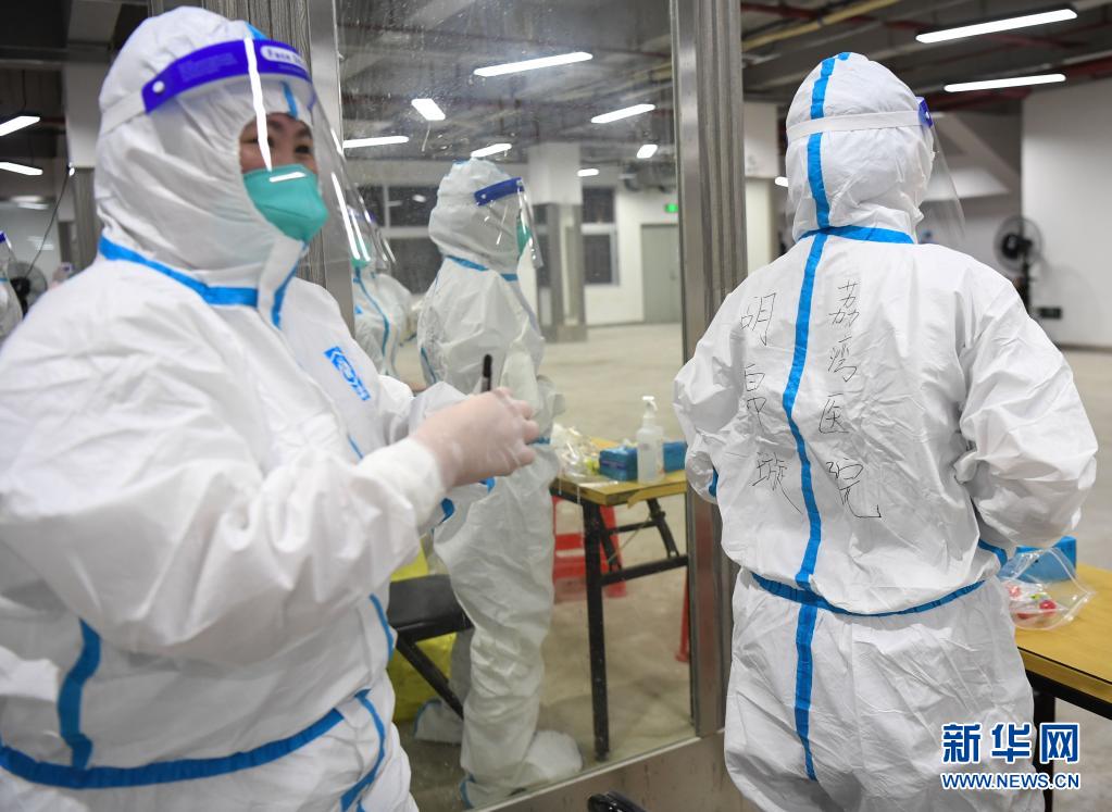 5月26日,在廣州荔灣體育館核酸檢測點,荔灣中心醫(yī)院的醫(yī)務人員在防護服上寫上個人信息。新華社記者 鄧華 攝