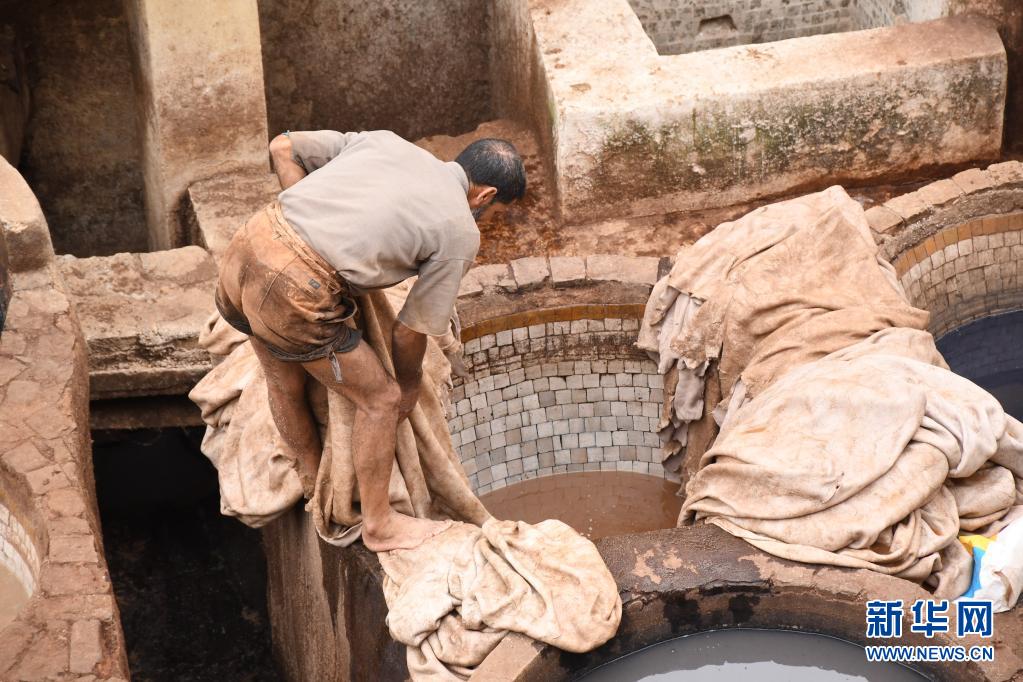 5月30日,工人正在摩洛哥非斯古城內(nèi)的皮革染坊中勞作。
