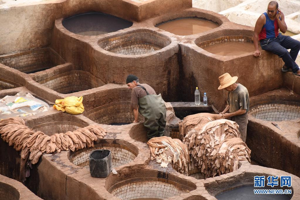 5月30日,工人正在摩洛哥非斯古城內的皮革染坊中勞作。