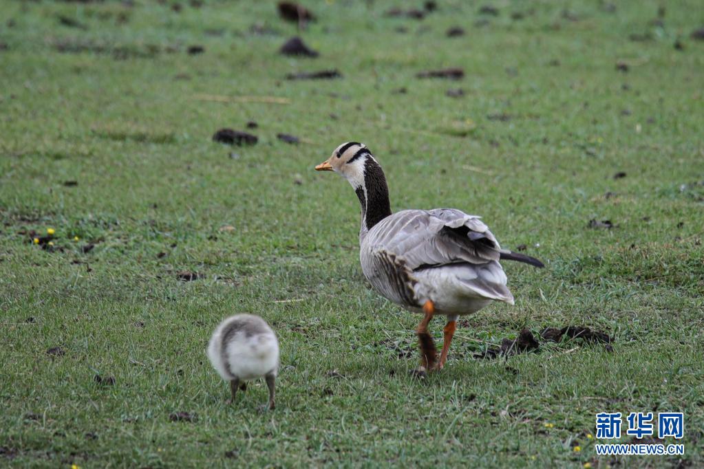 這是6月2日在甘肅省甘南藏族自治州碌曲縣尕海湖拍攝的斑頭雁及其幼鳥。