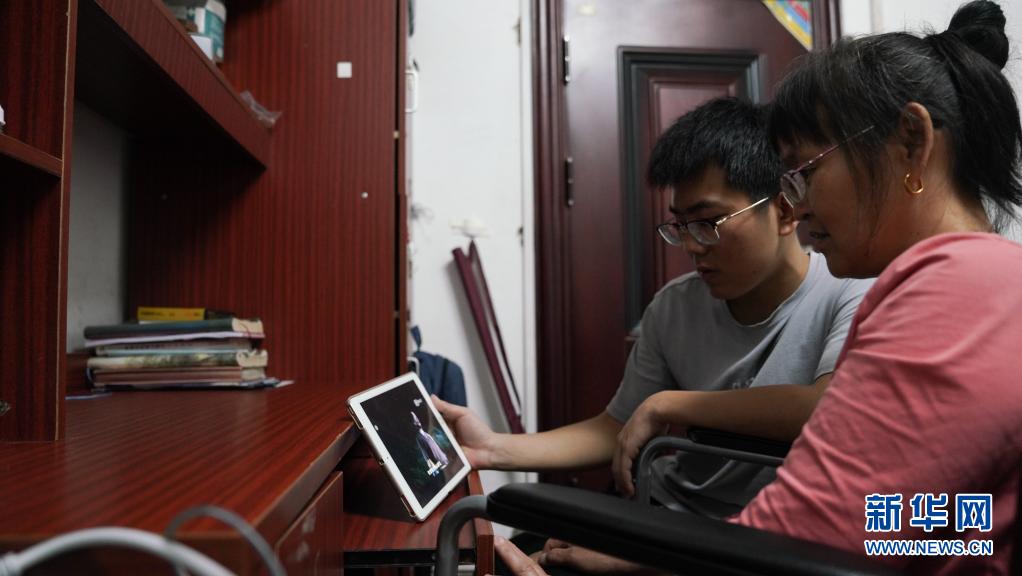 6月2日,趙建軍和母親在宿舍內用平板電腦觀看電視劇。新華社記者胡晨歡攝
