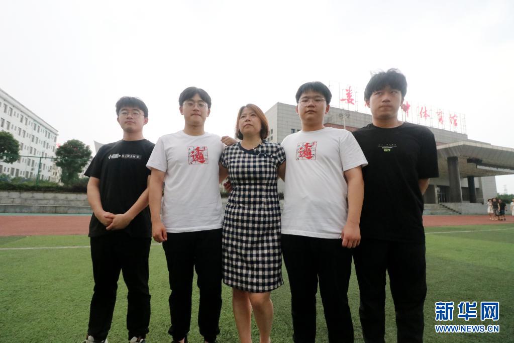 6月9日,在湖南省婁底市第四中學(xué),四胞胎兄弟李慶國(左一)、李慶泰(左二)、李慶民(右二)、李慶強(qiáng)(右一)在高考結(jié)束后和媽媽合影。