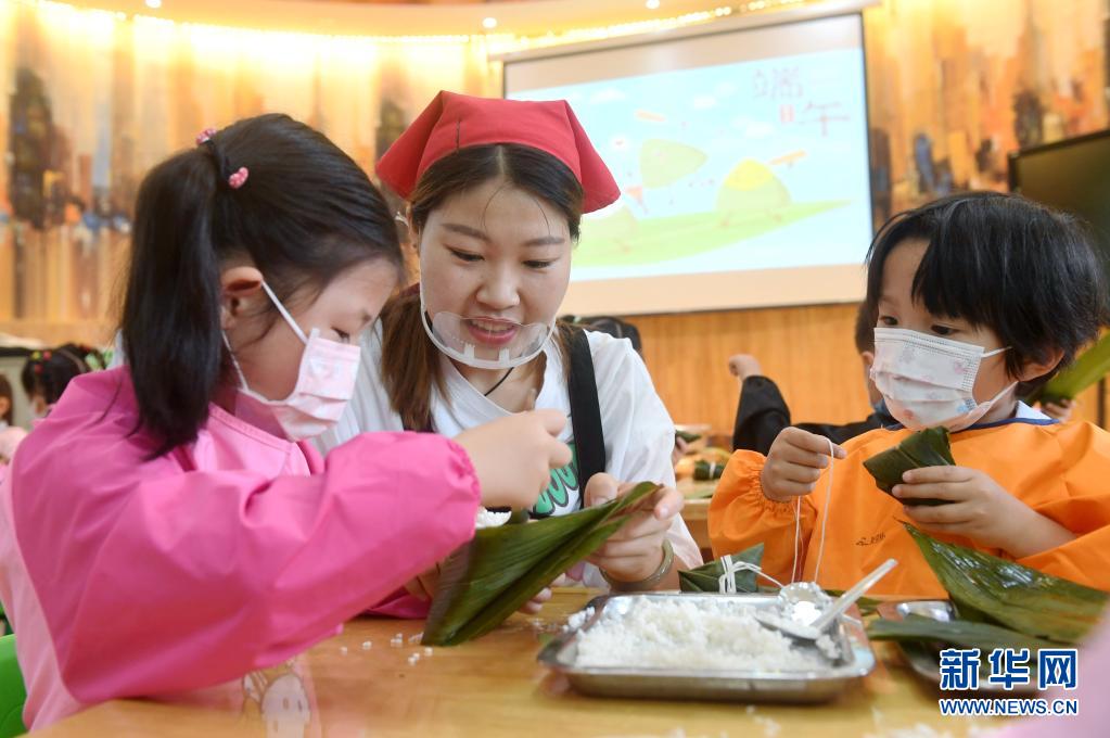 6月10日,石家莊市橋西區(qū)第三幼兒園的小朋友在包粽子。