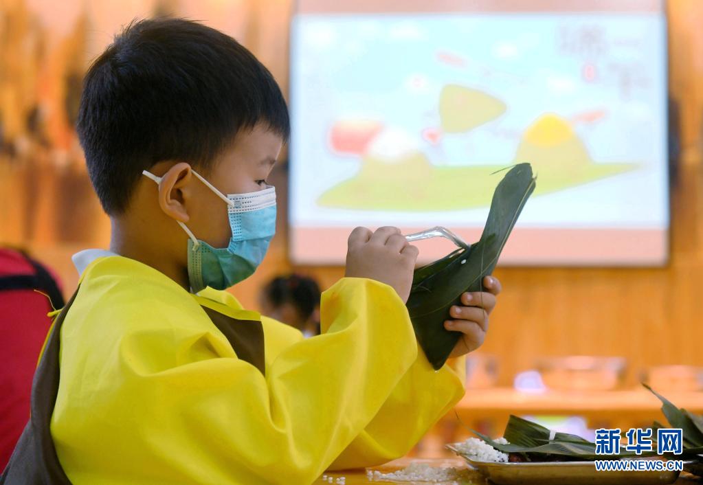 6月10日,石家莊市橋西區(qū)第三幼兒園的小朋友在包粽子。