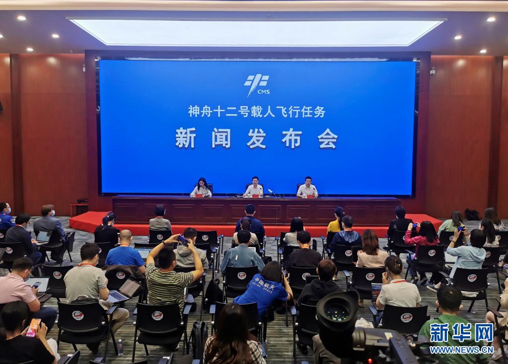 6月16日,神舟十二號載人飛行任務(wù)新聞發(fā)布會在酒泉衛(wèi)星發(fā)射中心召開(手機拍攝)。