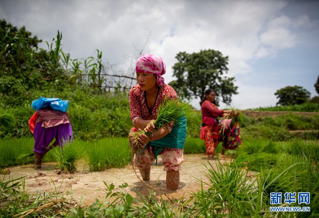 6月29日,農民在尼泊爾中部勒利德布爾附近的稻田里插秧。