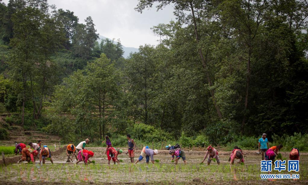 6月29日,農民在尼泊爾中部勒利德布爾附近的稻田里插秧。