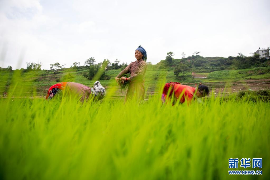 6月29日,農民在尼泊爾中部勒利德布爾附近的稻田里插秧。