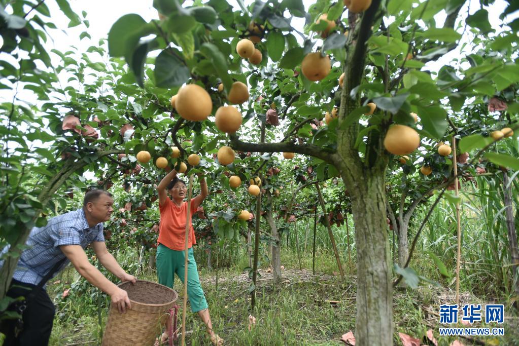 7月5日,四川省內(nèi)江市東興區(qū)椑木鎮(zhèn)長豐村村民在摘梨。