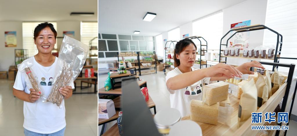 拼版照片:左圖為楊王芳在展示山西省平順縣產的黨參;右圖為楊王芳在平順縣龍鎮村電商服務中心整理貨架(7月8日攝)。近年來,平順縣大力發展電子商務,開展直播培訓、孵化、就業指導等,努力培養農村電商人才。2019年初,一直在外打工的楊王芳得知村里發展電子商務,覺得前景廣闊,回到村里加入電商隊伍。隨著電商飛速發展,龍鎮村搭上了“數字快車”,村里的農副產品供不應求,黨參、松花粉、小雜糧等成為熱賣產品。