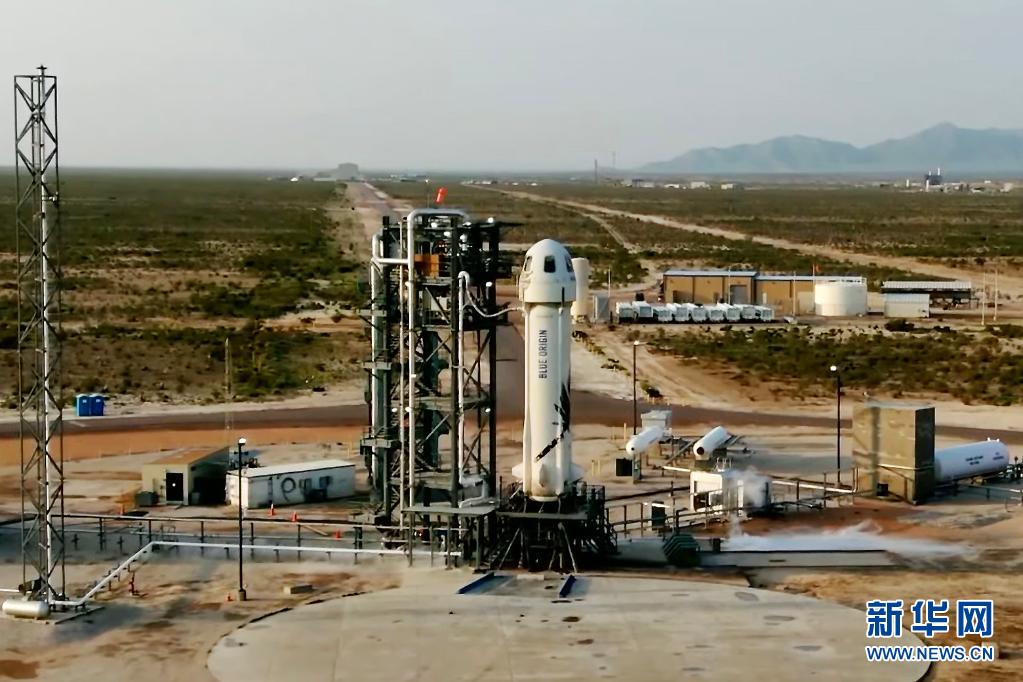 這張美國藍色起源公司7月20日發布的視頻截圖顯示“新謝潑德”飛行器在美國得克薩斯州西部一處發射場準備升空。