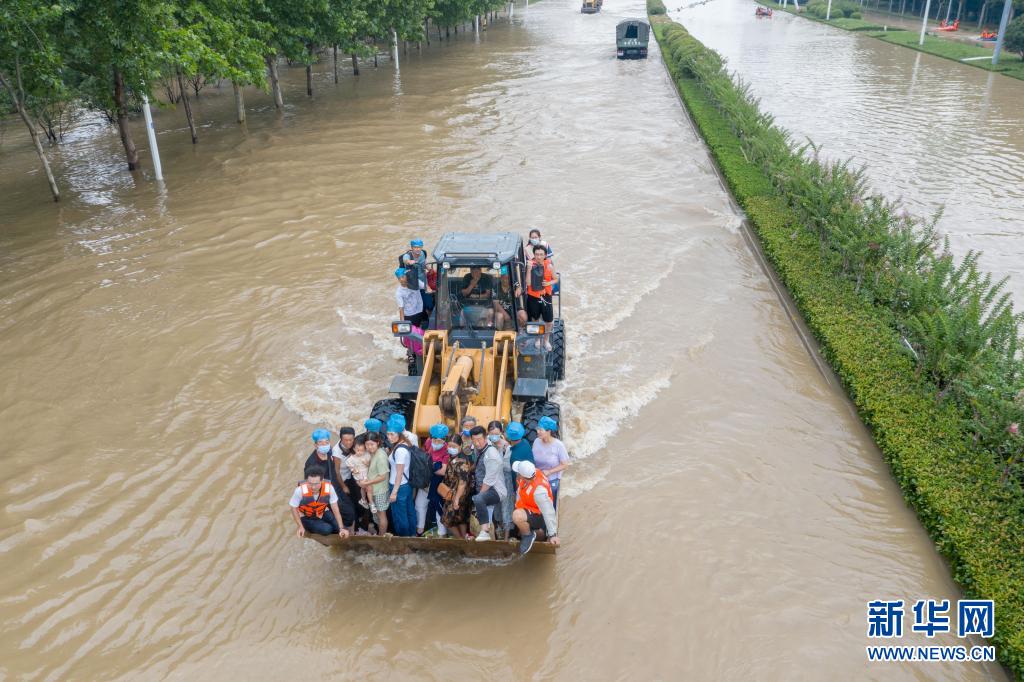 7月22日,在阜外華中心血管病醫(yī)院附近的錦繡路與鄭開(kāi)大道交叉口,救援人員利用鏟車(chē)轉(zhuǎn)移人員(無(wú)人機(jī)照片)。
