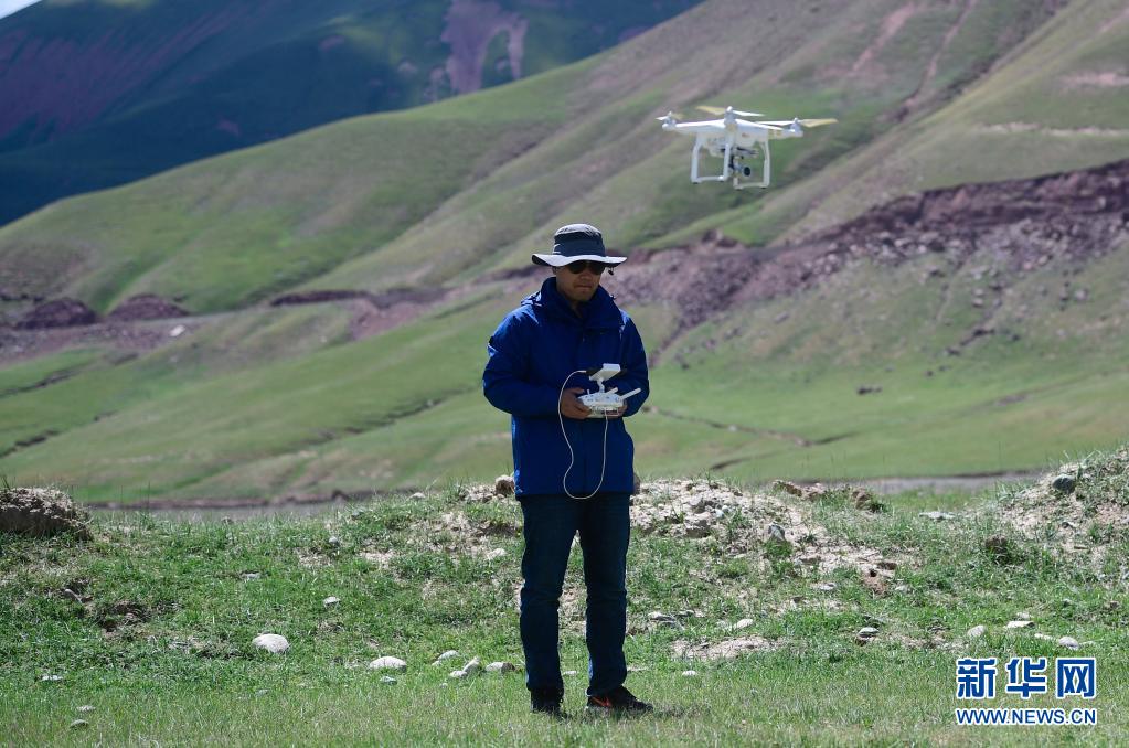 2021年長江源綜合科考的科考隊員趙保成在使用無人機觀測長江源地區生態環境(7月24日攝)。