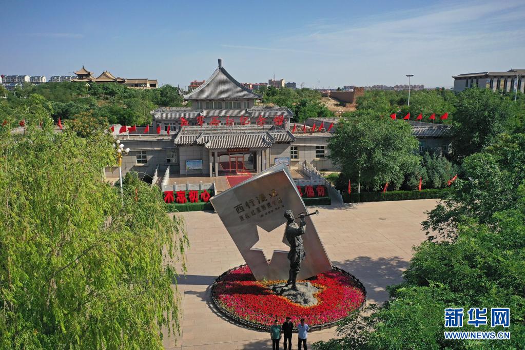寧夏吳忠市同心縣紅軍西征紀(jì)念館前的“抗戰(zhàn)之聲”小號(hào)手雕塑(6月22日攝,無人機(jī)照片)。新華社記者 王鵬 攝