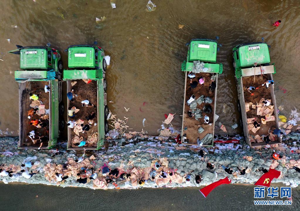 當日,在河南省鶴壁市浚縣傅莊堤上,不少群眾自發(fā)前來和救援人員一起裝沙袋、運沙袋,共筑堤壩。受持續(xù)強降雨影響,浚縣防汛形勢嚴峻,傅莊堤主要為浚縣縣城及26個村莊提供保護。新華社記者 李安 攝