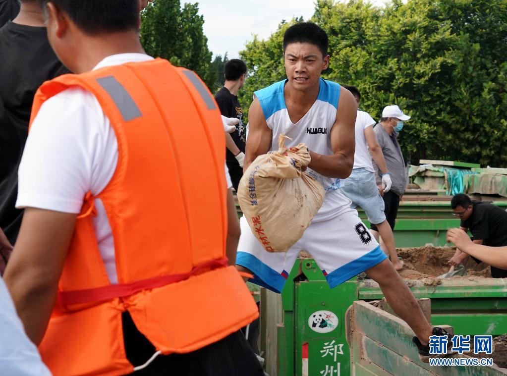 當日,在河南省鶴壁市??h傅莊堤上,不少群眾自發前來和救援人員一起裝沙袋、運沙袋,共筑堤壩。受持續強降雨影響,??h防汛形勢嚴峻,傅莊堤主要為??h縣城及26個村莊提供保護。新華社記者 李安 攝