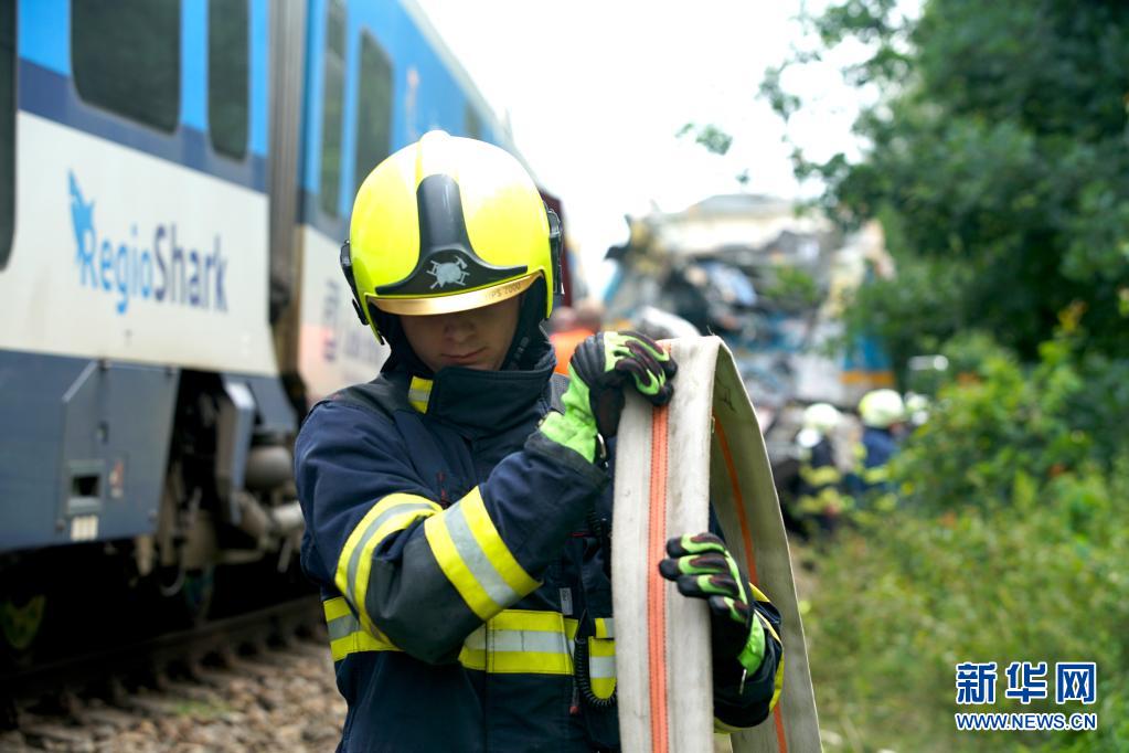 8月4日,救援人員在捷克比爾森州的火車相撞事故現場工作。