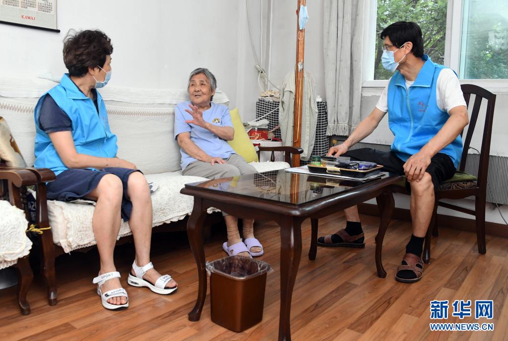 8月14日,在北京市海淀區薊門里社區,董星梅(左)和丈夫馮向東(右)與他們的志愿服務對象交談。