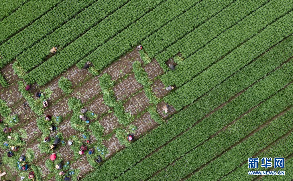 8月13日,在四川省阿壩藏族羌族自治州紅原縣刷經寺鎮加當村,當地群眾在收割高原萵筍(無人機照片)。