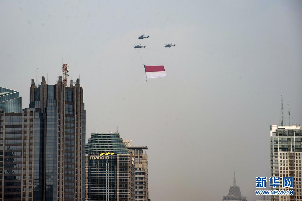 8月17日,懸掛印度尼西亞國旗的直升機飛過雅加達上空。8月17日是印度尼西亞獨立日。新華社發(維里攝)
