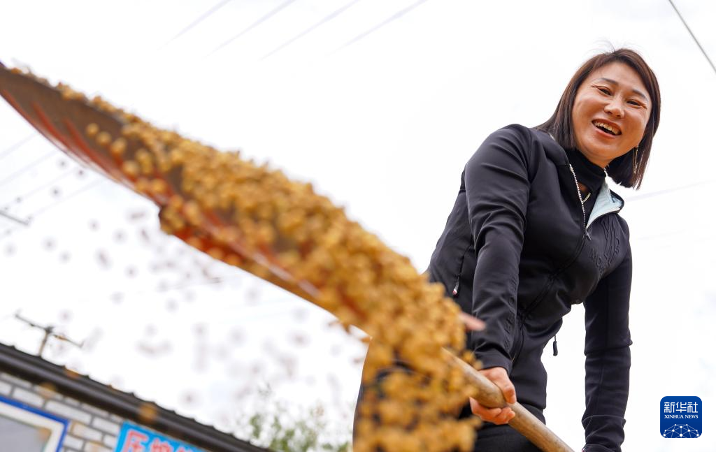 10月9日,韩凤香在合作社内晾晒刚收获的大豆。