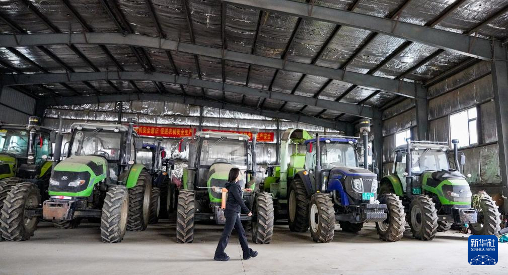 10月9日,韩凤香在合作社的农机具库里查看农机使用情况。