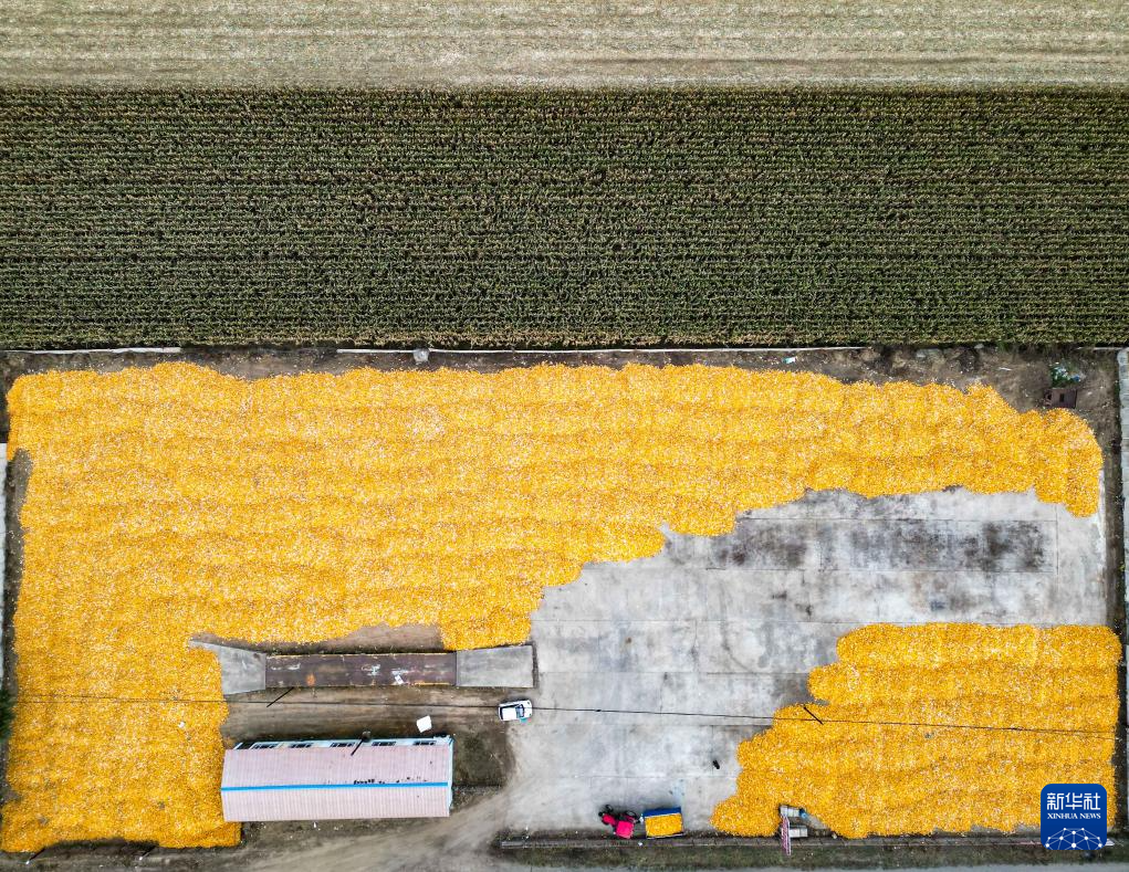 这是10月9日拍摄的梨树县凤凰山农机农民专业合作社收获的玉米(无人机照片)。
