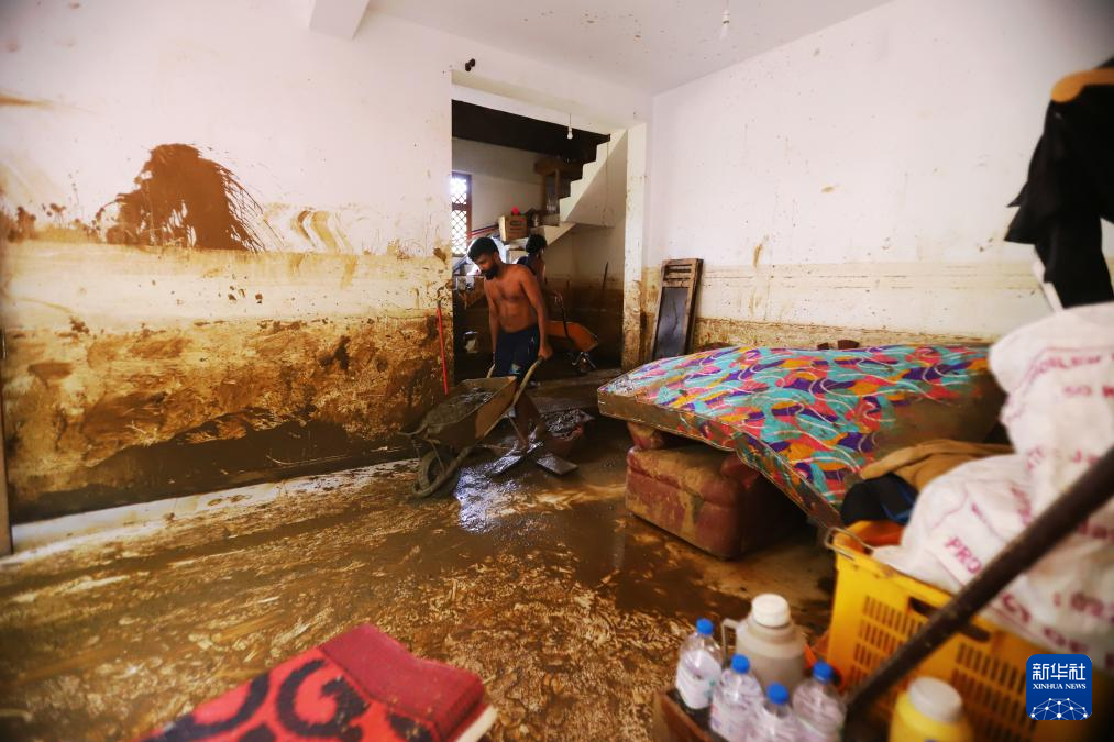 12月12日,一名男子在斯里兰卡巴杜勒地区一处房屋内清淤。