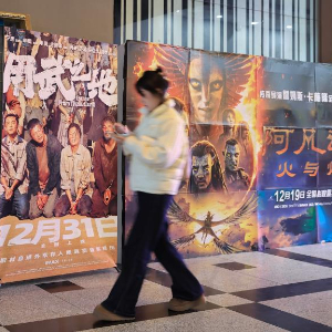 12月13日,观众从江苏南京一家电影院的电影宣传海报前走过。