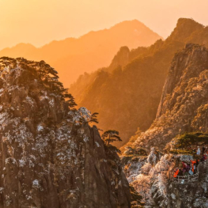雪后初霁的安徽省黄山风景区银装素裹,初升的朝阳与奇松、怪石交相映衬,吸引众多游客前来赏雪观景。