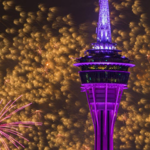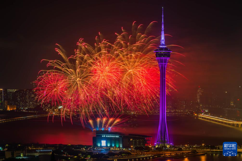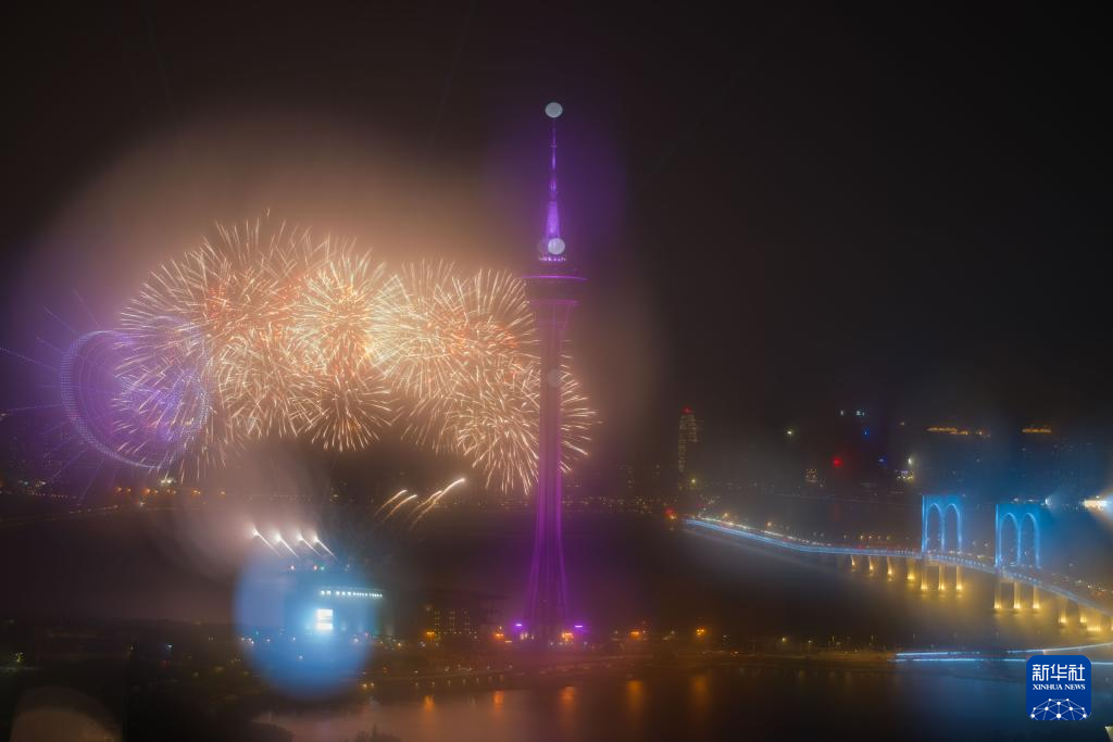 3月7日,澳门旅游局在澳门旅游塔对出海面举行“金骏云翔 欢乐春节”2026无人机烟花汇演第三场。