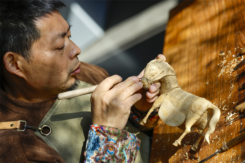 近日,在安徽省黄山市徽州区,国家级非遗项目(徽州竹雕)代表性传承人洪建华正在雕刻作品《马上进宝》。