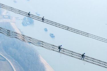 近日,我国“西电东送”重要通道——±800千伏特高压金塘线启动全面检修。在安徽省铜陵市枞阳县长江边,检修工人穿戴专业防护设备,在最高达345米的特高压输电线路上攀爬走线、精心作业,保障输电线路安全。